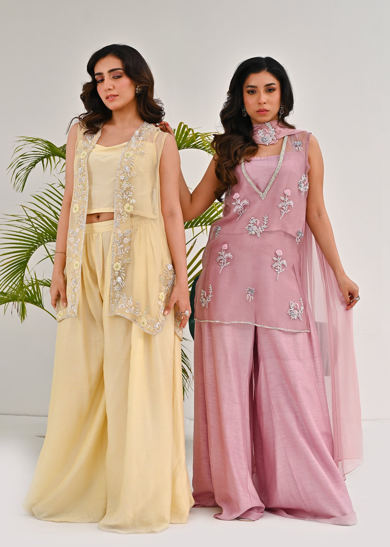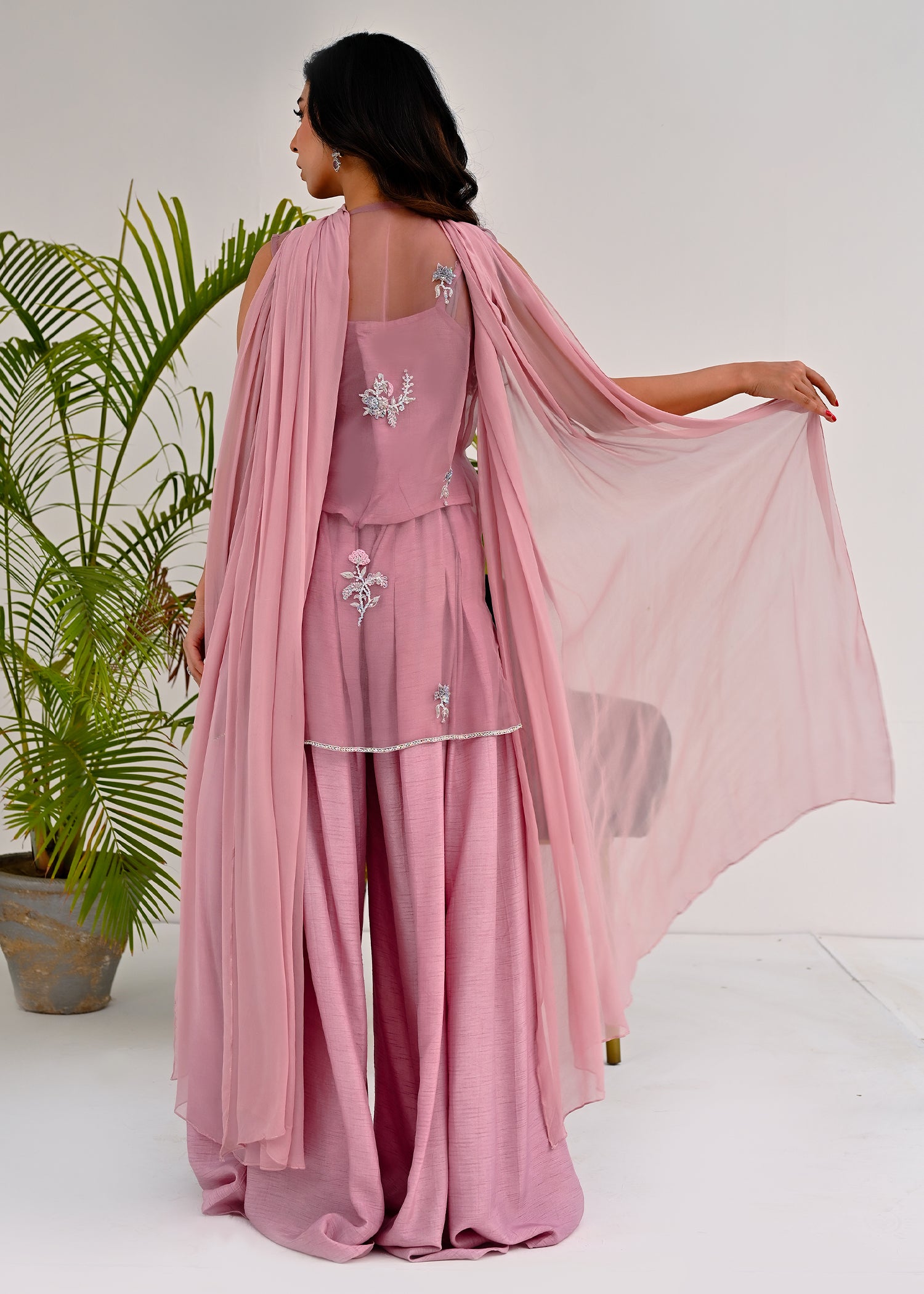 Description : Crafted in a muted rose hue, this ensemble embodies understated festivity and modern grace. The layered sleeveless tunic is delicately adorned with hand-embellished silver floral motifs, adding dimension and subtle radiance. An intricately detailed neckline lends a refined focal point, elevating the silhouette with quiet opulence. The fluid wide-leg trousers create effortless movement, balancing structure with softness. Designed in a lightweight textured fabric, the look feels both airy and luxurious. Perfect for Eid gatherings and intimate celebrations, it speaks to timeless femininity. A harmonious blend of tradition and contemporary sophistication, made for the woman who carries elegance with ease.